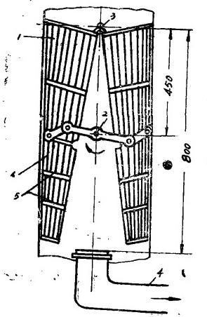 關于開關膠球清洗裝置也有二種方案,一種是現(xiàn)采用的,優(yōu)點是開關方便一些;缺點是杠桿系統(tǒng)和旋轉(zhuǎn)軸都“貫穿”循環(huán)水管,增大了水阻,即使處于“短路”狀態(tài)此水阻仍去不掉。另一種利用類似于潤門開關,在收球網(wǎng)之外開和關,(圖3乙)它在“短路”狀態(tài)時,開啟機構已旋出循環(huán)水管外,可減少短路時的水阻,當然機構稍復雜一點,開關稍費事。我們擬在”3機采用這種機構,以和“4機對比。