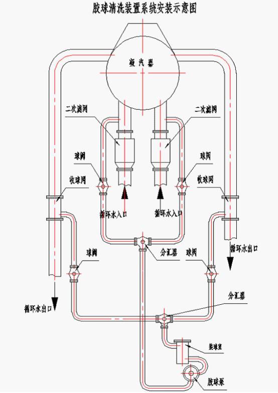 將膠球泵的引出管接在兩臺二次濾網的上端,其中間裝有2只球閥,分匯器1臺。