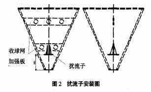 3)經過與廠家協商,為克服循環水出口壓力偏高造成的膠球在收球網內的強烈旋轉,如圖2所示,在膠球清洗裝置內部加裝擾流子,要求擾流子材質為Q235,擾流子和收球網加強板要可靠地焊接。以降低凝汽器循環水出口的壓力及膠球在收球網內部的旋轉強度,從而使膠球順利地落入收球網底部,及時送人收球泵人口管道。