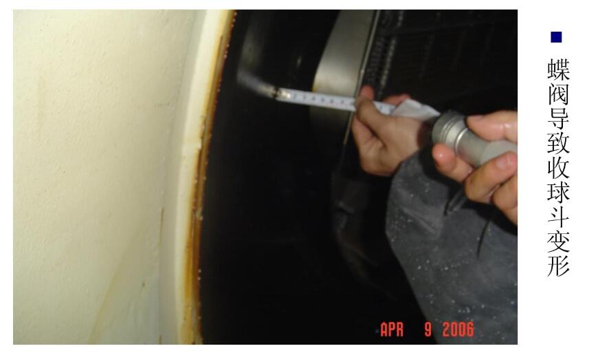 3.回水蝶閥碰收球網,收球斗變形。