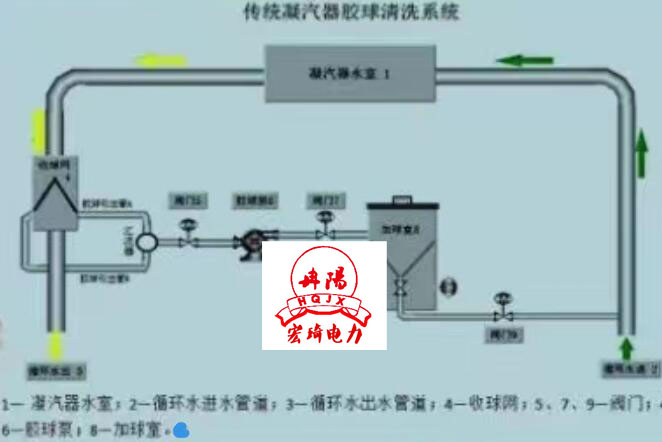 3、海綿剝皮膠球在系統中運行方式:膠球在系統中排隊方式流動,從收球網→膠球泵 →加球室→循環水進水管道→凝汽器水室入口→凝汽器水室出口→收球網循環。