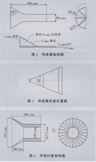 (2)在收球網(wǎng)距出球口900mm處加裝導(dǎo)流罩,通過(guò)導(dǎo)流罩改變了循環(huán)水流向,使循環(huán)水向收球網(wǎng)網(wǎng)板擴(kuò)散,加強(qiáng)該區(qū)域循環(huán)水流撓動(dòng),防止膠球附著在收球網(wǎng)網(wǎng)板上。安裝前需打開(kāi)收球網(wǎng)人孔,并使收球網(wǎng)處于打開(kāi)狀態(tài),然后將加工好的導(dǎo)流罩用筋板焊接在收球網(wǎng)上。導(dǎo)流罩結(jié)構(gòu)、安裝位置和導(dǎo)流襯套結(jié)構(gòu)見(jiàn)圖2、圖3、圖4所示。