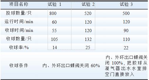 為驗(yàn)證凝汽器內(nèi)部結(jié)構(gòu)對(duì)收球率的影響進(jìn)行了3次試驗(yàn),試驗(yàn)數(shù)據(jù)見(jiàn)表2試驗(yàn)3。